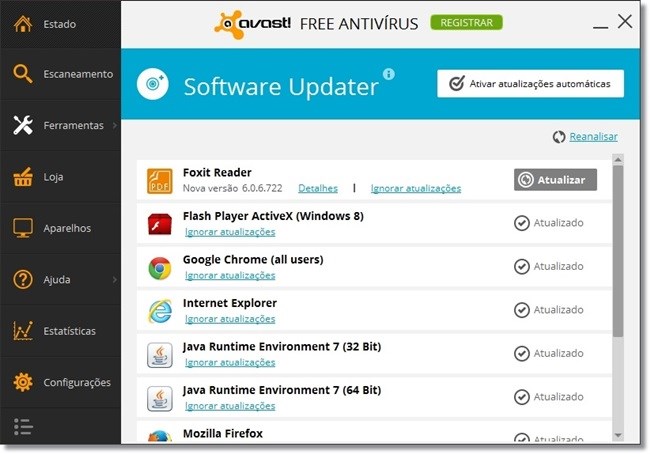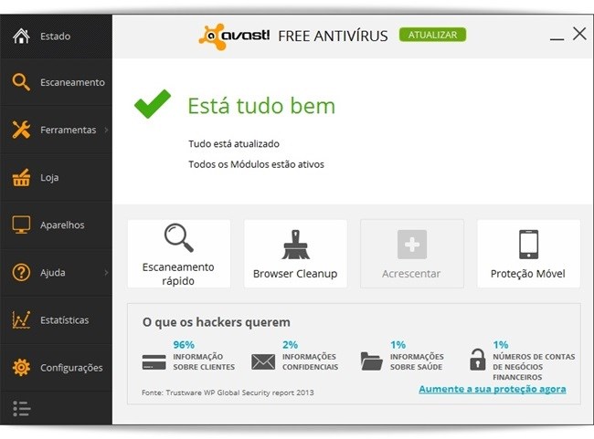 Além de ter o seu visual renovado, o aplicativo ganhou novos recursos para proteger você enquanto navega pela web, menor tempo na atualização da lista de vírus e mecanismo para restauração do sistema operacional — isso sem falar que ele está ainda mais veloz. Aparência renovadaDe cara, a primeira novidade que você vai notar no Avast! Free Antivirus 2014 é a sua interface totalmente reformulada. Com um menu monocromático à esquerda, você vai localizar tudo de forma mais “tradicional”, digamos assim, com o conteúdo de cada categoria sendo exibido no restante da tela. A estrutura geral do antivírus também mudou. Apesar de não ter eliminado nenhuma funcionalidade, o aplicativo “enxugou” a quantidade de módulos disponíveis, visando que a sua interação com as funções oferecidas aconteça da forma mais simplificada possível.